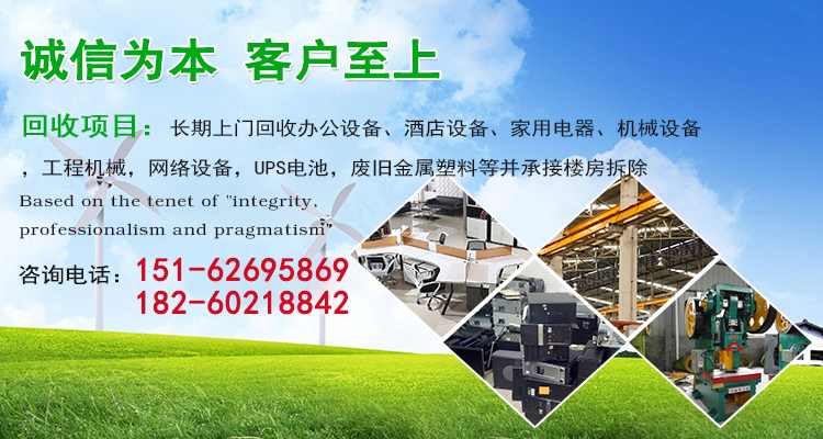 只要你一個(gè)電話(huà)我們將竭誠(chéng)服務(wù)于,上海市各企事業(yè)單位、醫(yī)院、學(xué)校、賓館、寫(xiě)字樓、科研機(jī)構(gòu)及小區(qū)等.長(zhǎng)期上門(mén)回收辦公設(shè)備、酒店設(shè)備、家用電器、機(jī)械設(shè)備,工程機(jī)械,網(wǎng)絡(luò)設(shè)備,UPS電池,廢舊金屬塑料等并承接樓房拆除、酒店搬遷、遷移等工程.本著〝誠(chéng)信、專(zhuān)業(yè)、務(wù)實(shí)”的宗旨,經(jīng)過(guò)員工的多年努力,目前業(yè)務(wù)已擴(kuò)展到上海周邊地區(qū).打造物資回收一直是我們不懈的追求,竭誠(chéng)歡迎與各界朋友進(jìn)行廣泛的各種形式的合作。為各企事業(yè)單位提供快速、周到的服務(wù)、同時(shí)可以簽定長(zhǎng)期回收協(xié)議。 歡迎新老客戶(hù),來(lái)電咨詢(xún),節(jié)假日不休息,信譽(yù)保證。