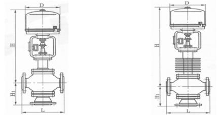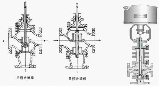 三通調(diào)節(jié)閥有三通合流式調(diào)節(jié)閥(把兩種流體經(jīng)三通閥混合成一種流體)和三通分流式調(diào)節(jié)閥(把一種流體經(jīng)三通閥分成兩路流出)兩種形式。當(dāng)公稱通徑DN≤80mm和壓差較小的場合時,分流閥可以采用同口徑的合流閥代替。流量特性有直線性、拋物線性兩種。