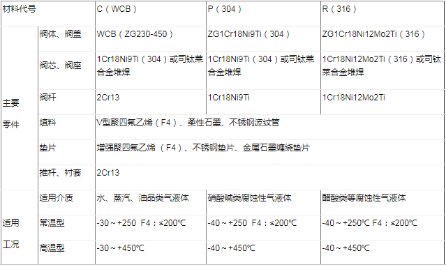 產(chǎn)品壓力等級有PN1.6 4.0 6.4MPa;公稱通徑DN25~300mm;適用流體溫度有-40~+450℃;按溫度高低配用不同閥蓋可分常溫型、高溫型兩種。